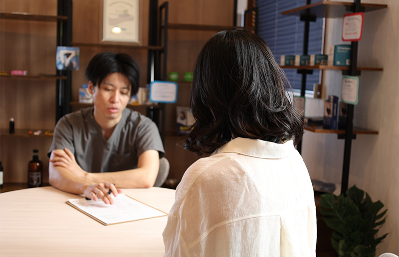 問診票の内容をもとに、現在のお悩みや生活習慣、施術の目的を丁寧に伺います。